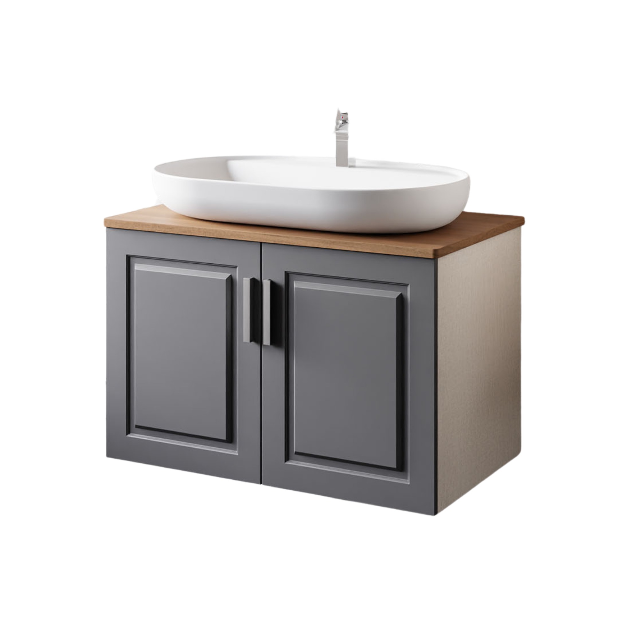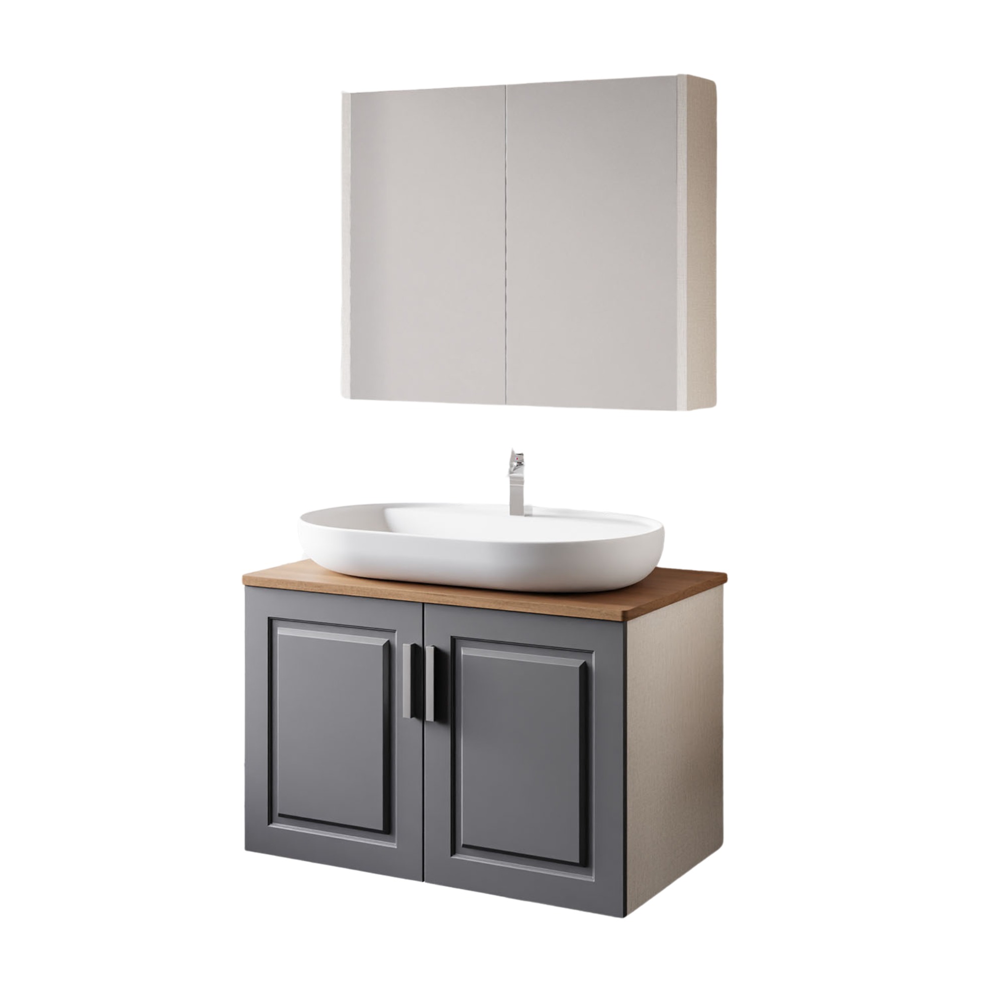Design zeigt sich hier in klar geführten Flächen und sauber ausgerichteten Fronten. Die matte Anthrazit Optik wirkt reduziert, der Korpus in Trendgrau fasst das Ensemble ruhig. Verchromte Bügelgriffe setzen einen eleganten Akzent. Auf 80 cm entsteht ein geordneter Waschplatz, hängend montiert für eine leichte Wirkung – ein Badmöbel set mit Spiegelschrank, das modern auftritt.