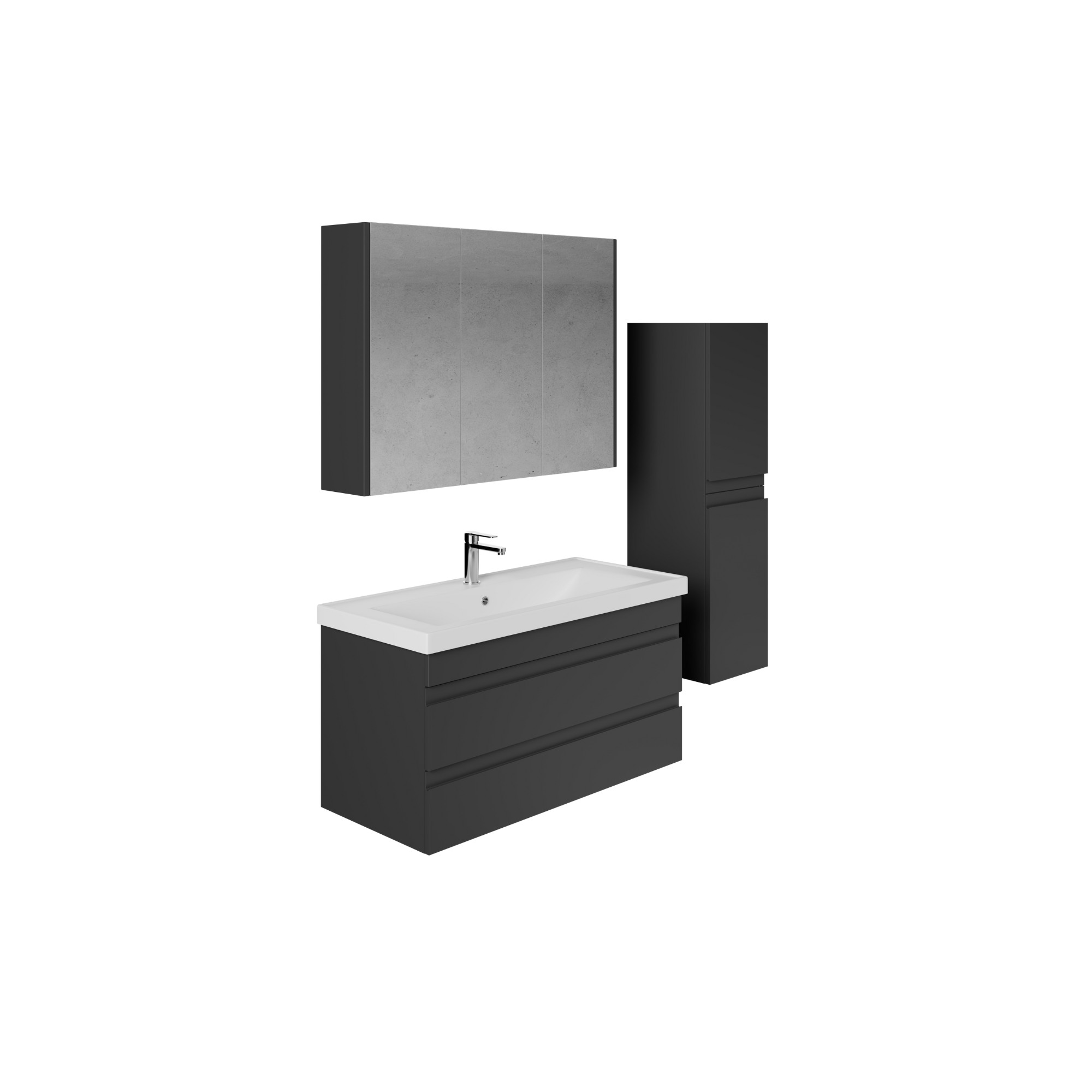 Badmöbel 3-er Set Lara in Anthrazit – 3-teilig mit Keramik-Waschbecken, Unterschrank & Spiegelschrank, 100 cm – Schlank & Edel