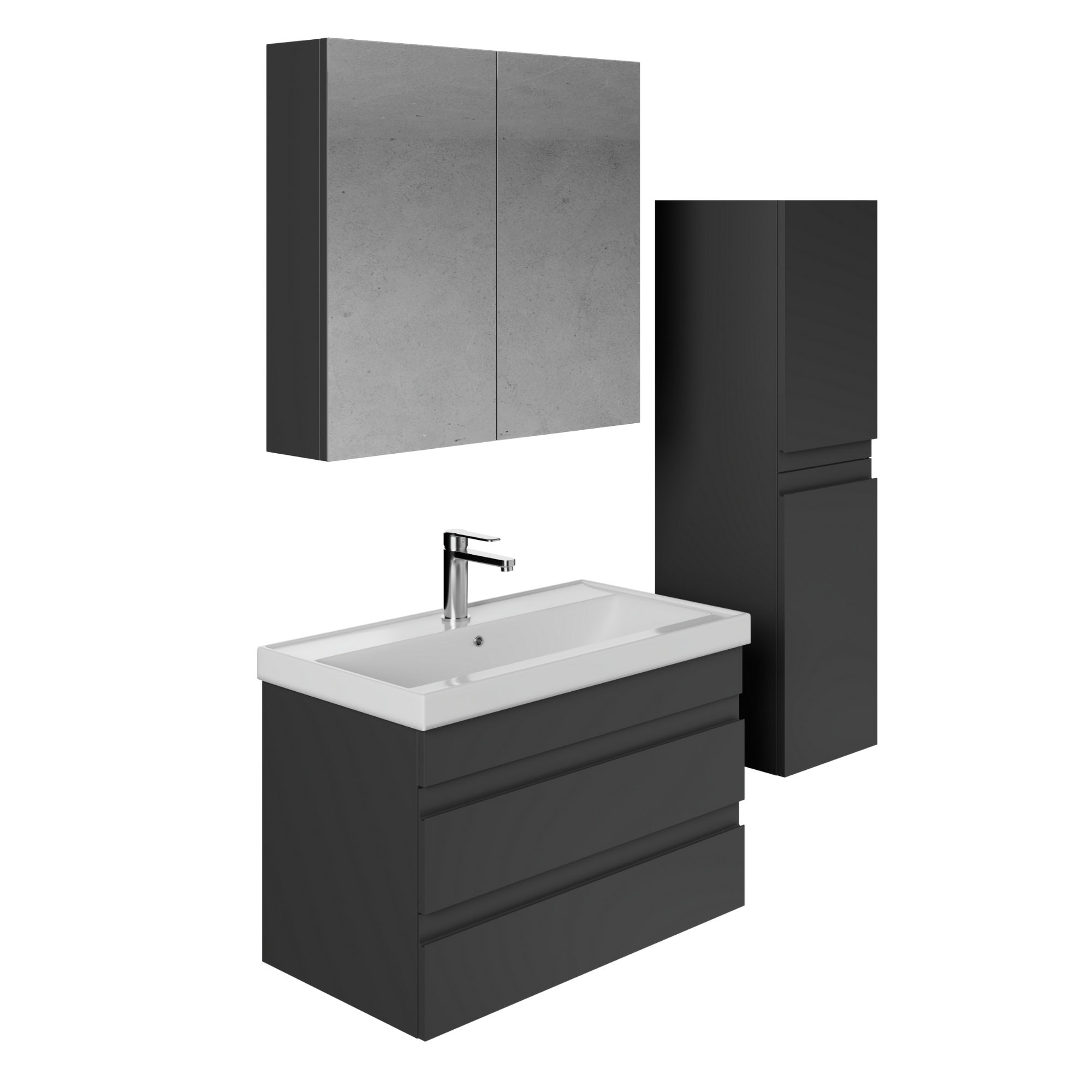 Badmöbel 3-er Set Lara in Anthrazit – 3-teilig mit Keramik-Waschbecken, Unterschrank & Spiegelschrank, 80 cm – Schlank & Edel