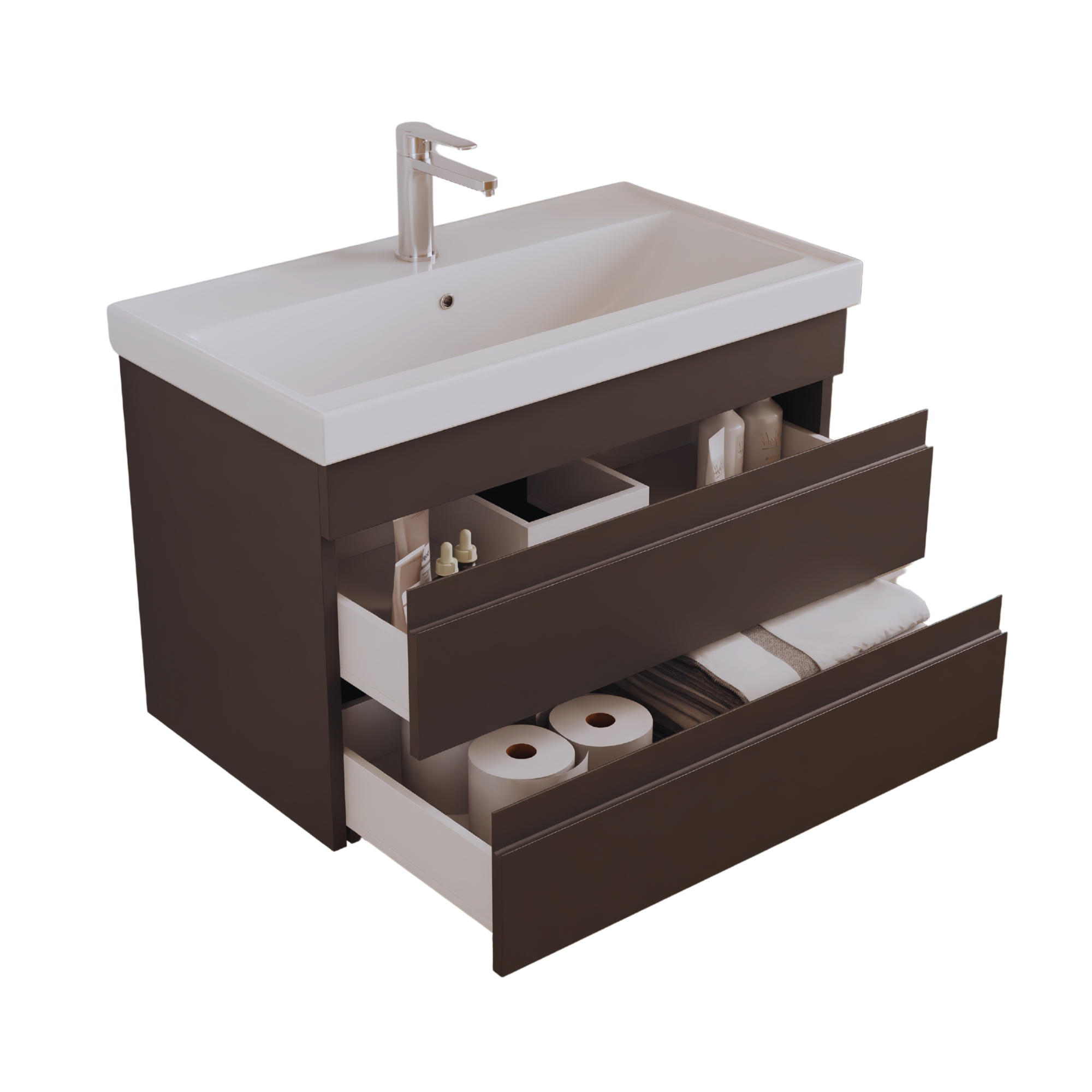 Das Badmöbel Set 80 cm in anthrazit sticht mit seiner Geradlinigkeit und Hochwertigkeit seiner Badezimmerschränke hervor. Der Waschtischunterschrank, das Keramikwaschbecken und der Spiegelschrank kombinieren sich zu einem 3er Badezimmermöbelset der besonderen Art. Ein passender Hochschrank, der gesondert dazu bestellt werden kann, vervollständigt das stilvolle Badkonzept für Designliebhaber.