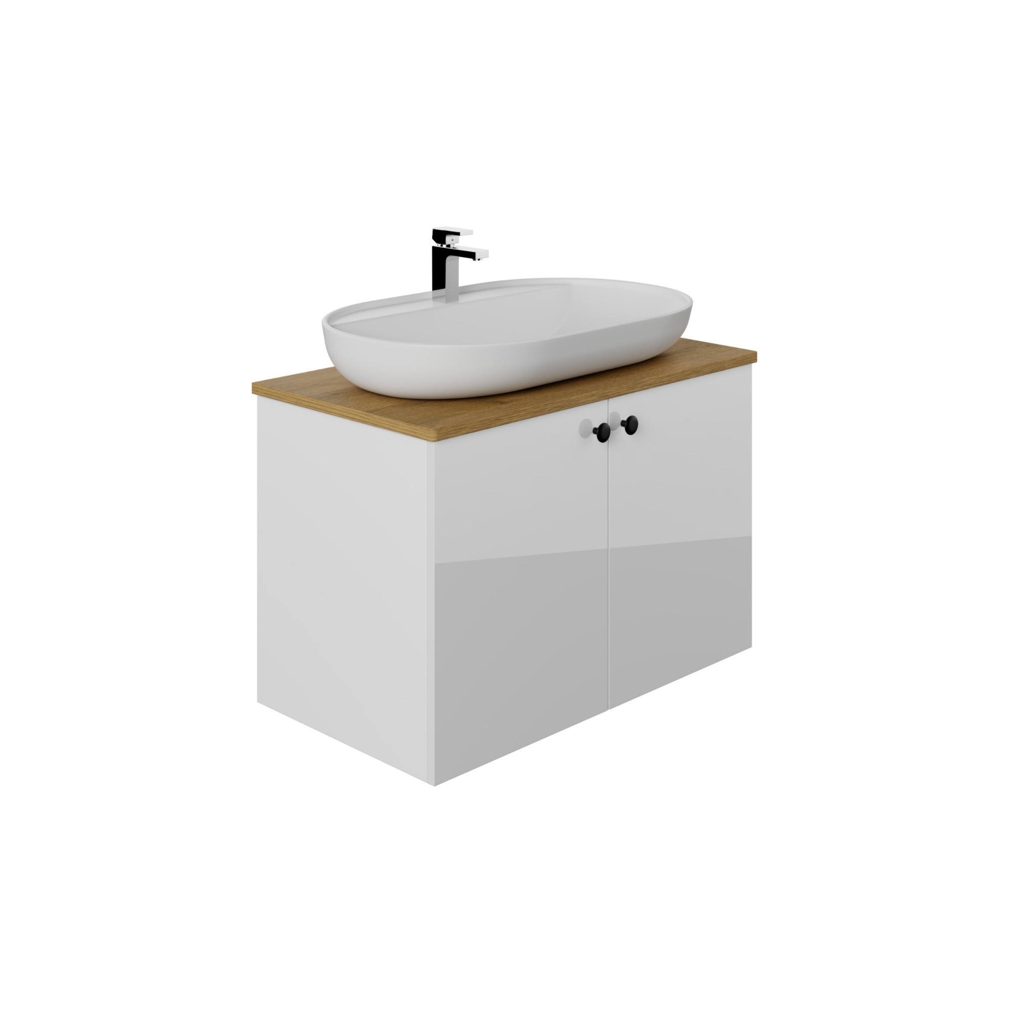 Das Badmöbel Set mit zwei Türen in weißer Farbe besteht aus drei Komponenten. Die drei Komponenten setzen sich zusammen aus Badezimmerunterschrank, Keramikwaschbecken und Spiegelschrank. Hierbei kann dieses Badezimmerschrank-Set in der Breite 60 cm oder 80 cm bestellt werden. Auf diese Weise eignet sich dieses Modell in mittelgroße, kleine und Gäste-Badezimmer. Die weißen Badezimmermöbel kommen mit einer Hochglanzbeschichtung und Sofclose-Türen.