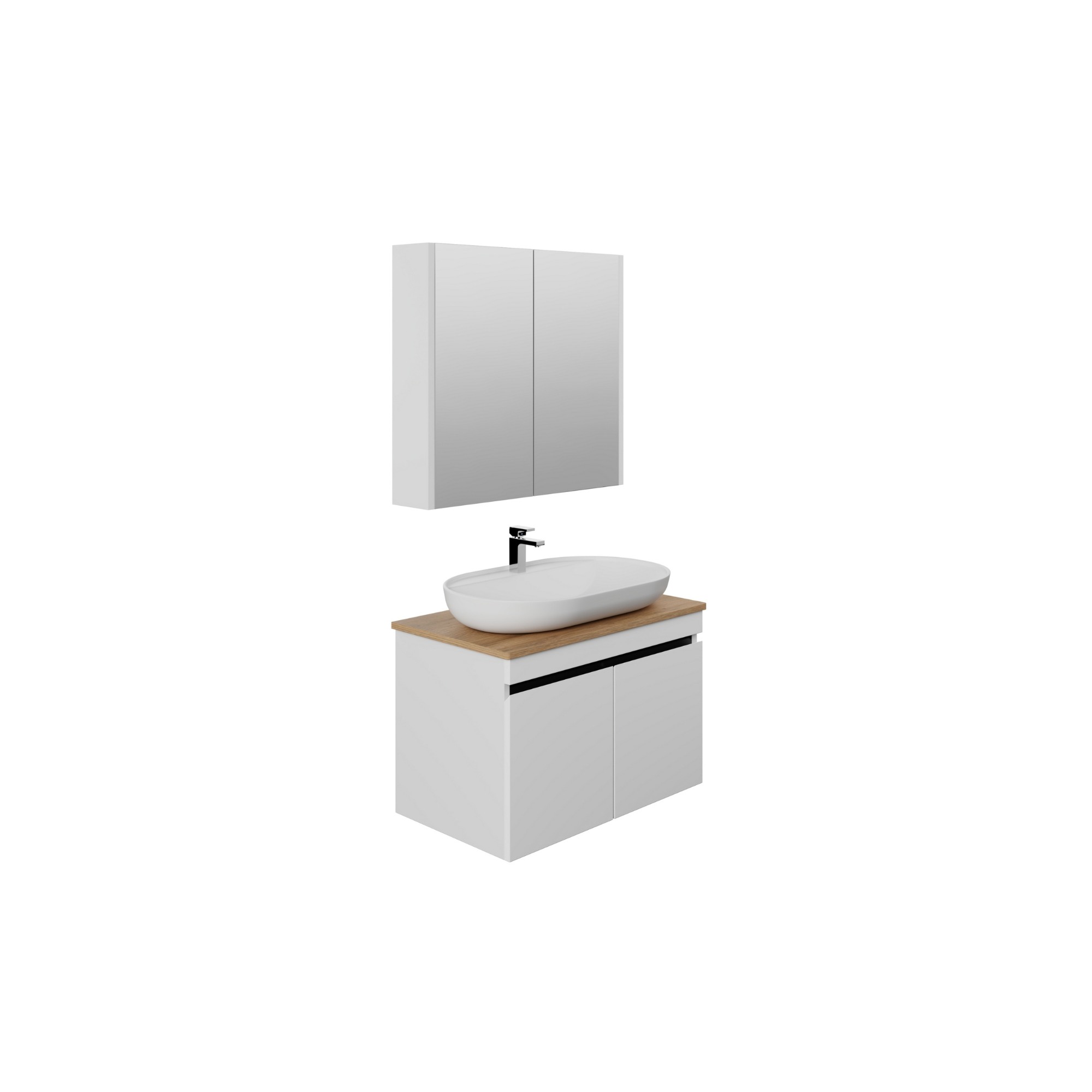 Dieses moderne Badezimmer Set besteht aus einem funktionalen Spiegelschrank, einem Unterschrank und einem eleganten Aufsatzwaschbecken aus Keramik inklusive der passenden Waschtischplatte im natürlichen Eiche-Dekor.