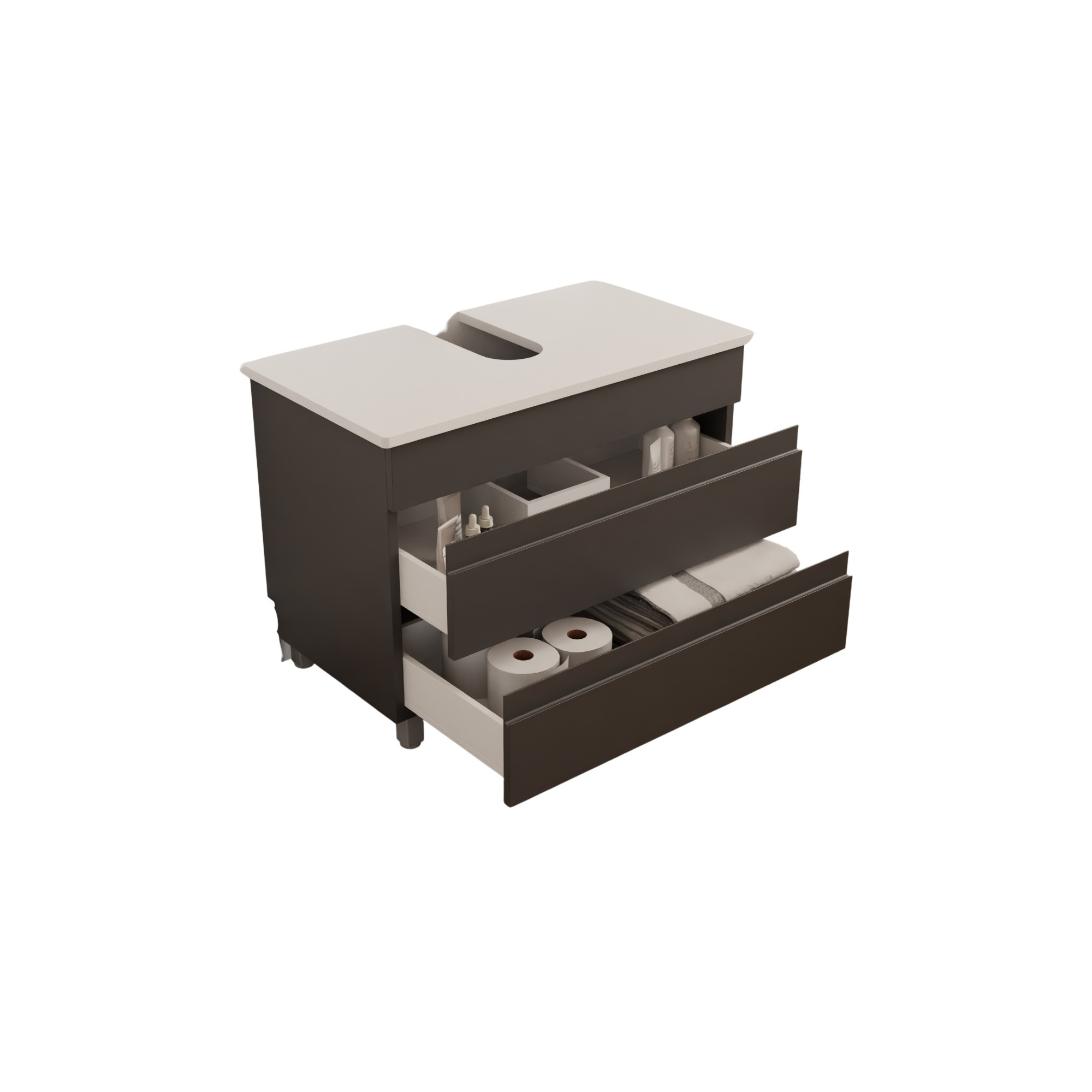 Sowohl der Korpus als auch die Schubladenfronten des Waschtischschranks sind in der Farbe Anthrazit gehalten. Die feinen Griffmulden bieten eine angenehme Haptik und die Softclose-Funktion ermöglicht ein geräuschloses Schließen der Schubladenfächer. Die obere Schublade besitzt zudem eine Siphonaussparung, wodurch die Ablaufgarnitur des Waschbeckens nicht mehr ins Auge fallen.