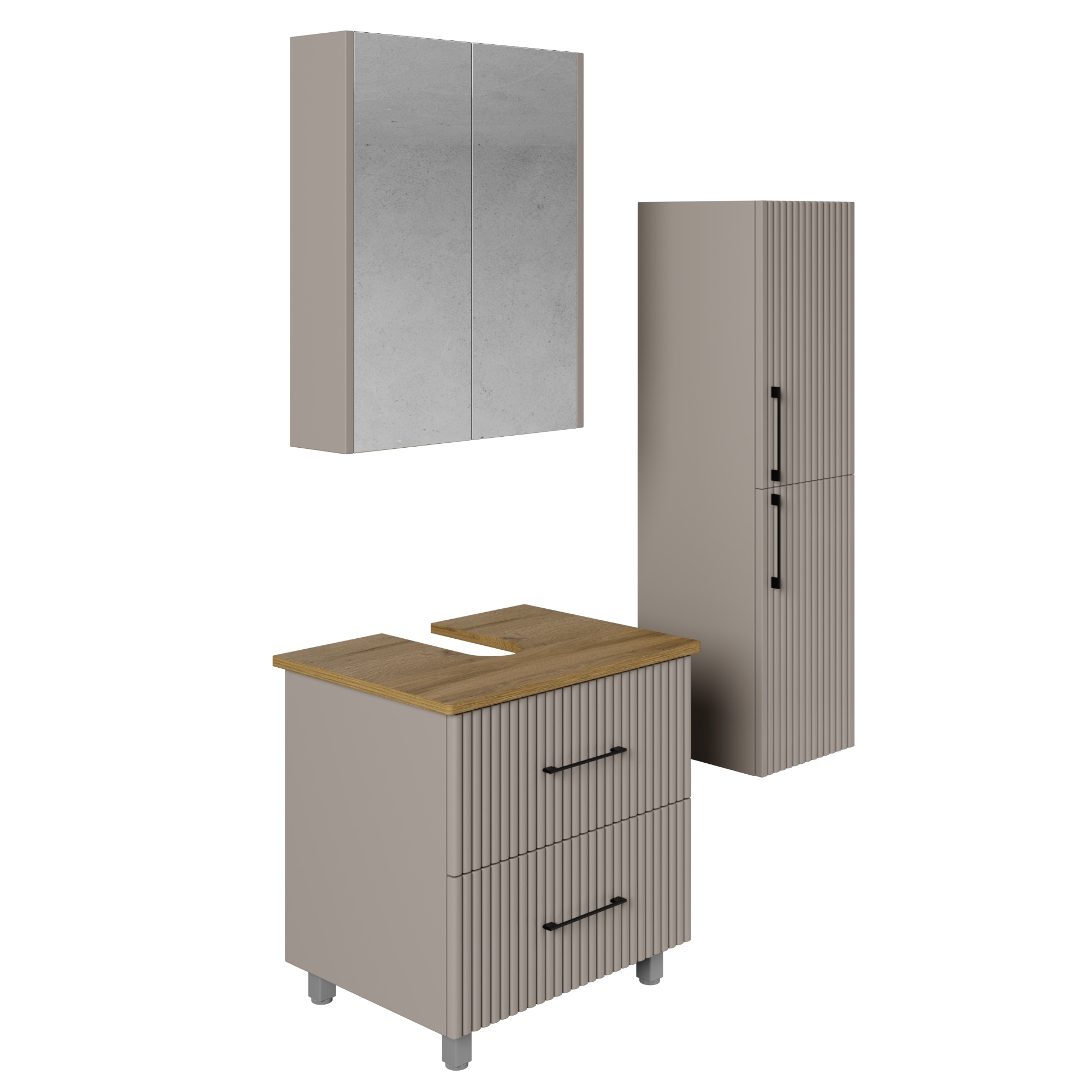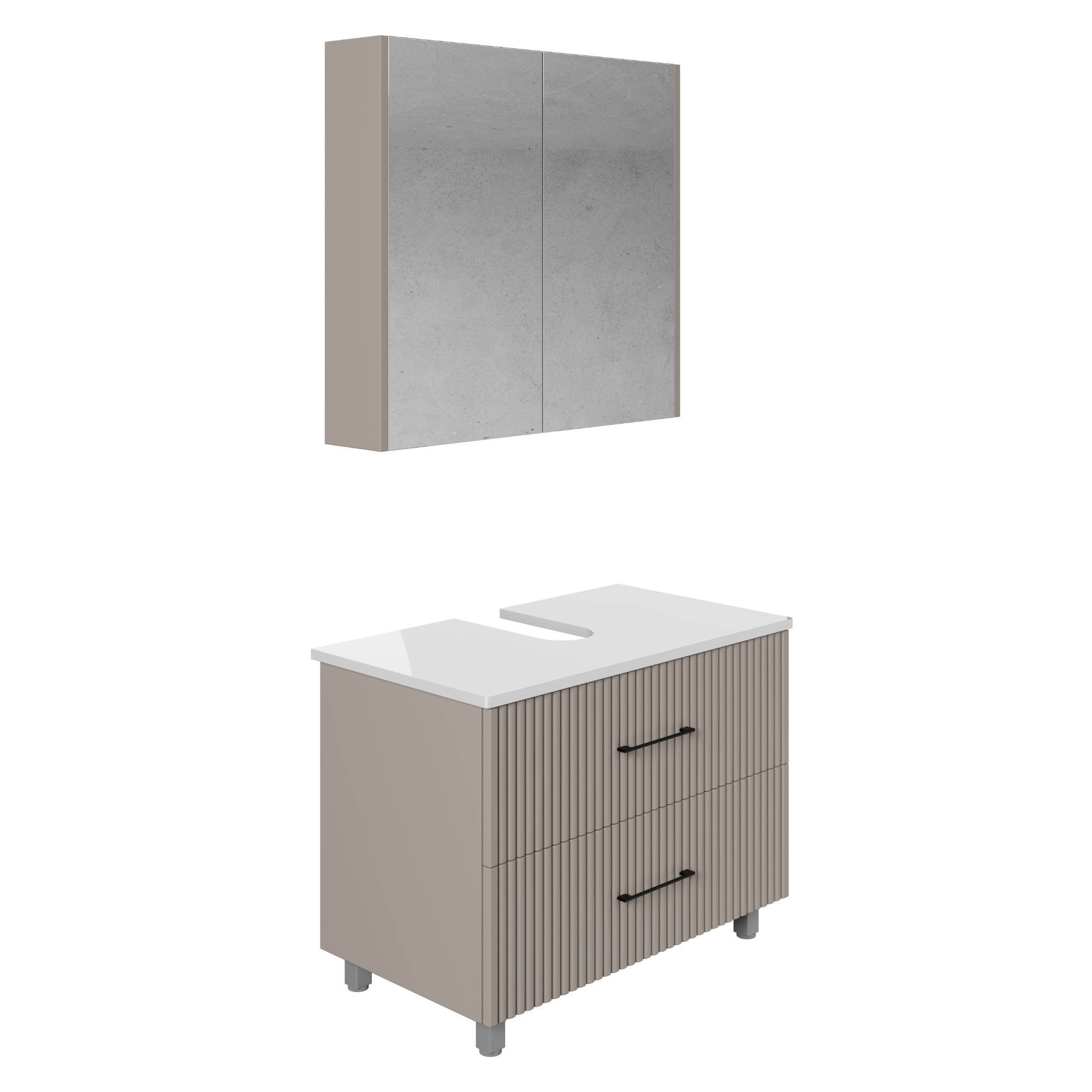 Der Lieferumfang umfasst einen Unterschrank mit Füßen und einen Spiegelschrank. Wahlweise kann ein Hochschrank zu diesem 2er-Badmöbelset dazu bestellt werden. Der Unterschrank, Spiegelschrank und Hochschrank werden in demontiertem Zustand verschickt, d.h. eine Eigenmontage auf Grundlage einer Anleitung wird erforderlich.