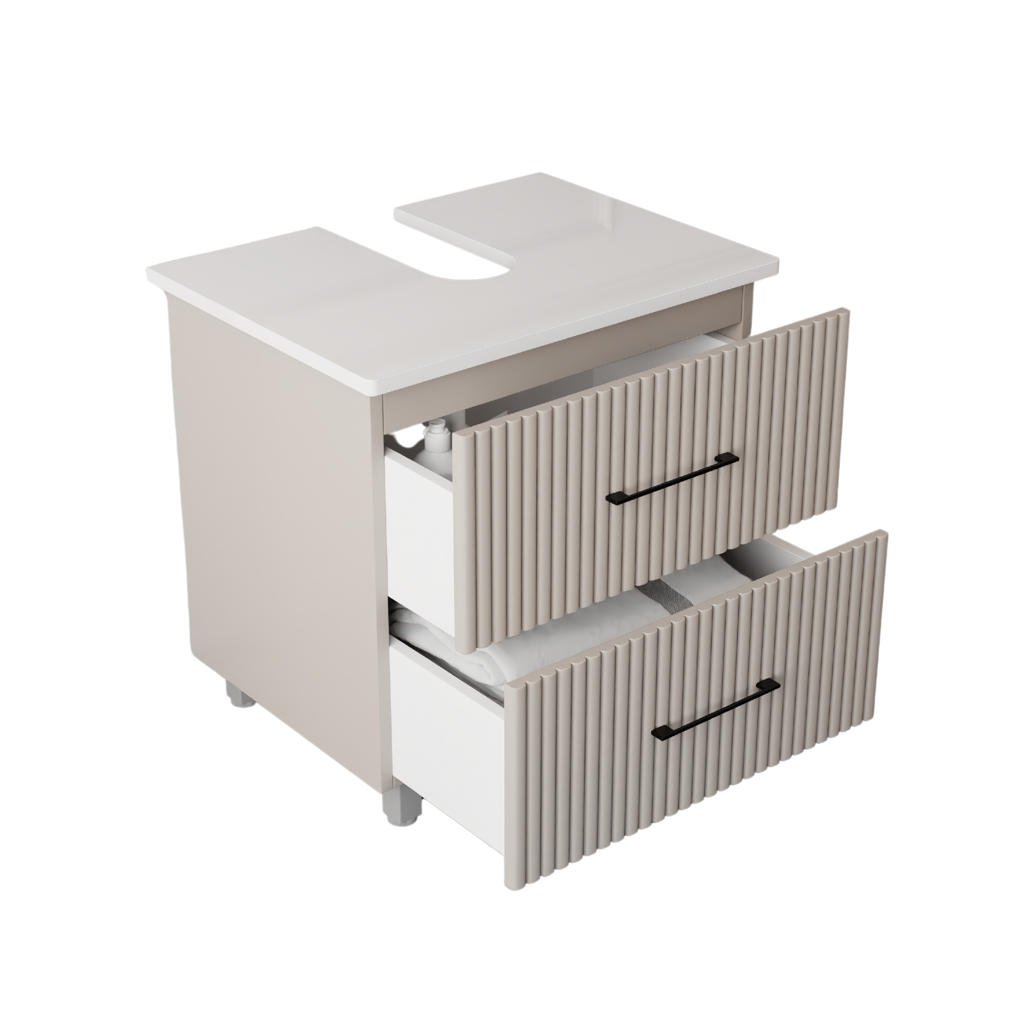 Der Waschtischunterschrank präsentiert sich in einem modernen Mid-Century-Stil der unter anderem durch die Riffeloptik der Fronten und den eleganten Metallgriffen hervorgerufen wird. Bei stehenden Badezimmerschränken in pastellgrau, stechen die filigran geformten und schwarz gefärbten Metallgriffe umso mehr in das Auge. Ein besonderes Detail ist die innovative Softclose-Technik, die ein sanftes und leises Schließen der Schubladen garantiert. Für eine aufgeräumte Optik ist die obere Schublade des Unterschranks auf Füßen mit einer cleveren Aussparung versehen, sodass die Abflussrohre diskret verborgen bleiben.