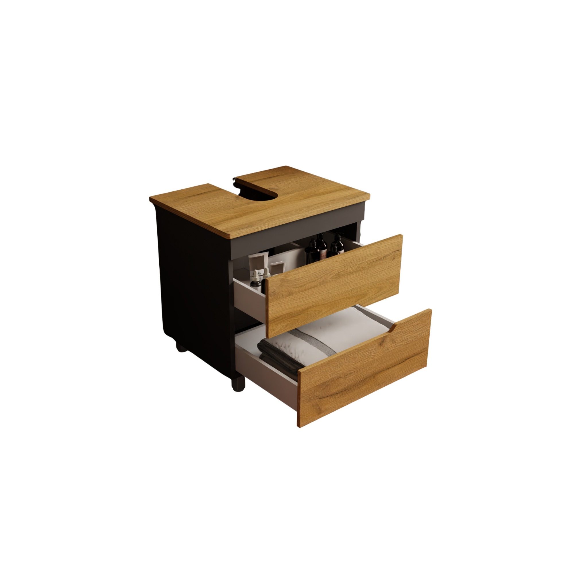 Der Unterschrank in 60 cm Breite überzeugt durch seine innovative Materialkombination: Die Oberfläche ist mit einer MDF Lam Beschichtung versehen, die Hygiene und Pflegeleichtigkeit vereint. Das Design des Badezimmerunterschranks stehend ist in Anthrazit und Eiche und lässt sich mit Accessoires und Elementen wie Haken individuell erweitern – so entsteht ein Badmöbel, das sich dem Alltag anpasst. Die Griffleisten des Waschbeckenunterschranks sind ergonomisch geformt und die Schubladen verfügen über ein Softclose-System.