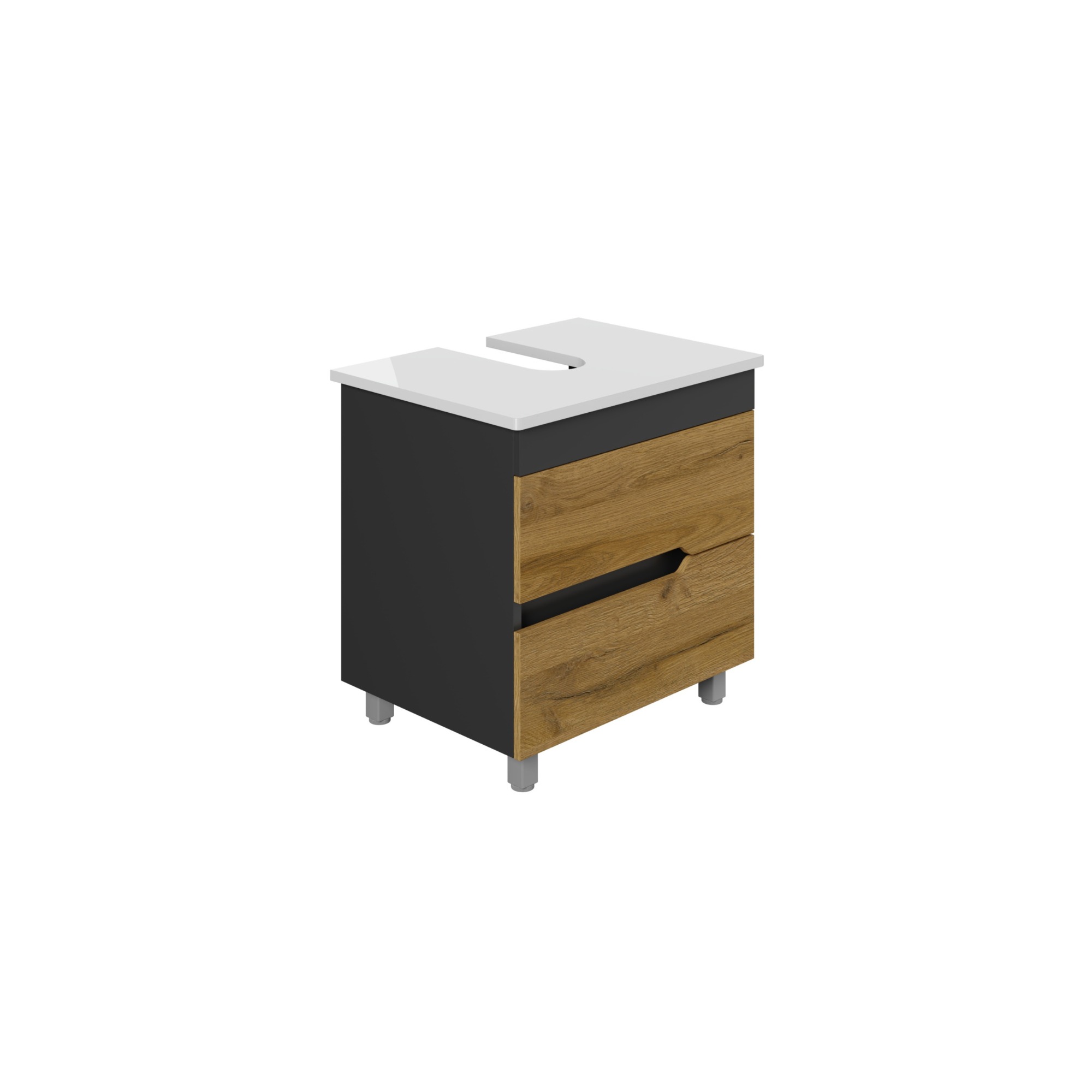 Der Unterschrank in 60 cm Breite überzeugt durch seine innovative Materialkombination: Die Oberfläche ist mit einer MDF Lam Beschichtung versehen, die Hygiene und Pflegeleichtigkeit vereint. Das Design des Badezimmerunterschranks stehend ist in Anthrazit und Eiche und lässt sich mit Accessoires und Elementen wie Haken individuell erweitern – so entsteht ein Badmöbel, das sich dem Alltag anpasst. Die Griffleisten des Waschbeckenunterschranks sind ergonomisch geformt und die Schubladen verfügen über ein Softclose-System.