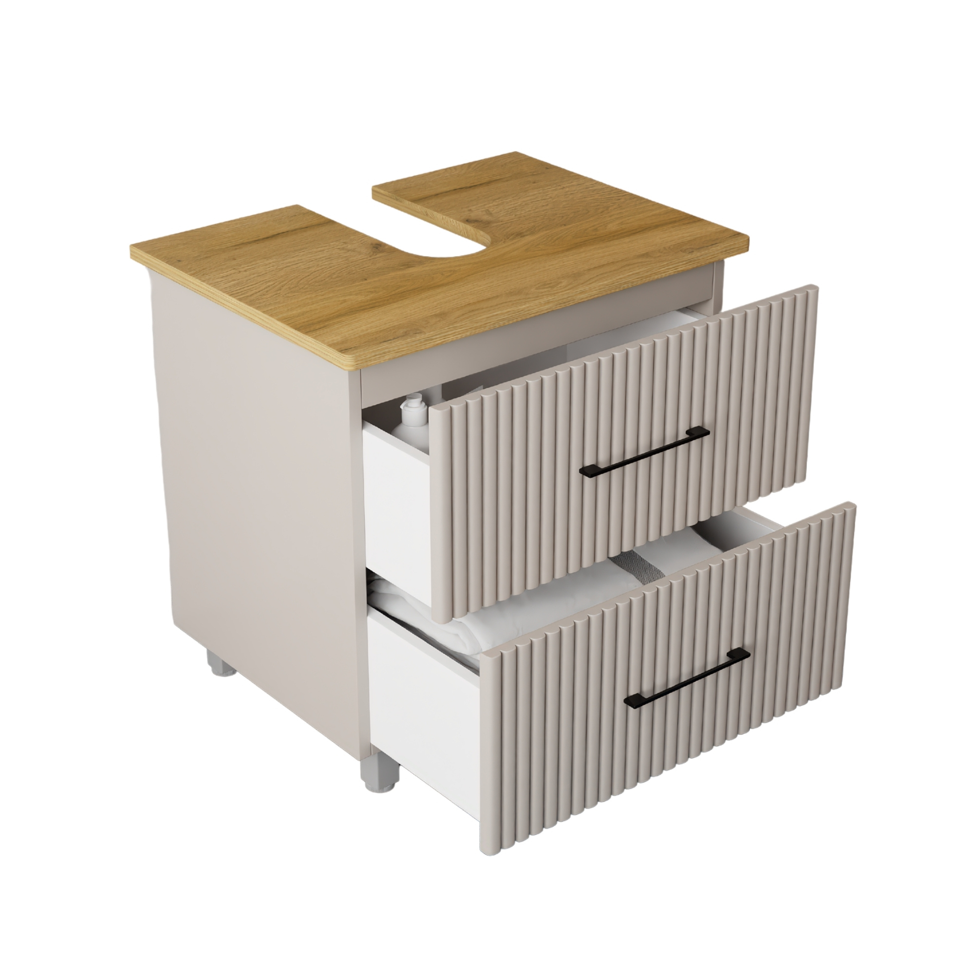 Die freistehenden Badunterschränke in pastellgrau erhalten durch eine stilvolle Deckplatte einen modernen Abschluss. Diese Platte ist mit einer Aussparung versehen, die die Abflussrohre elegant verdeckt. Für die individuelle Gestaltung stehen verschiedene Farbvarianten zur Auswahl: eine klassische weiße Oberfläche für einen frischen Look oder eine Platte in Eichenholz-Optik, die dem Badezimmer eine warme und natürliche Note verleiht.