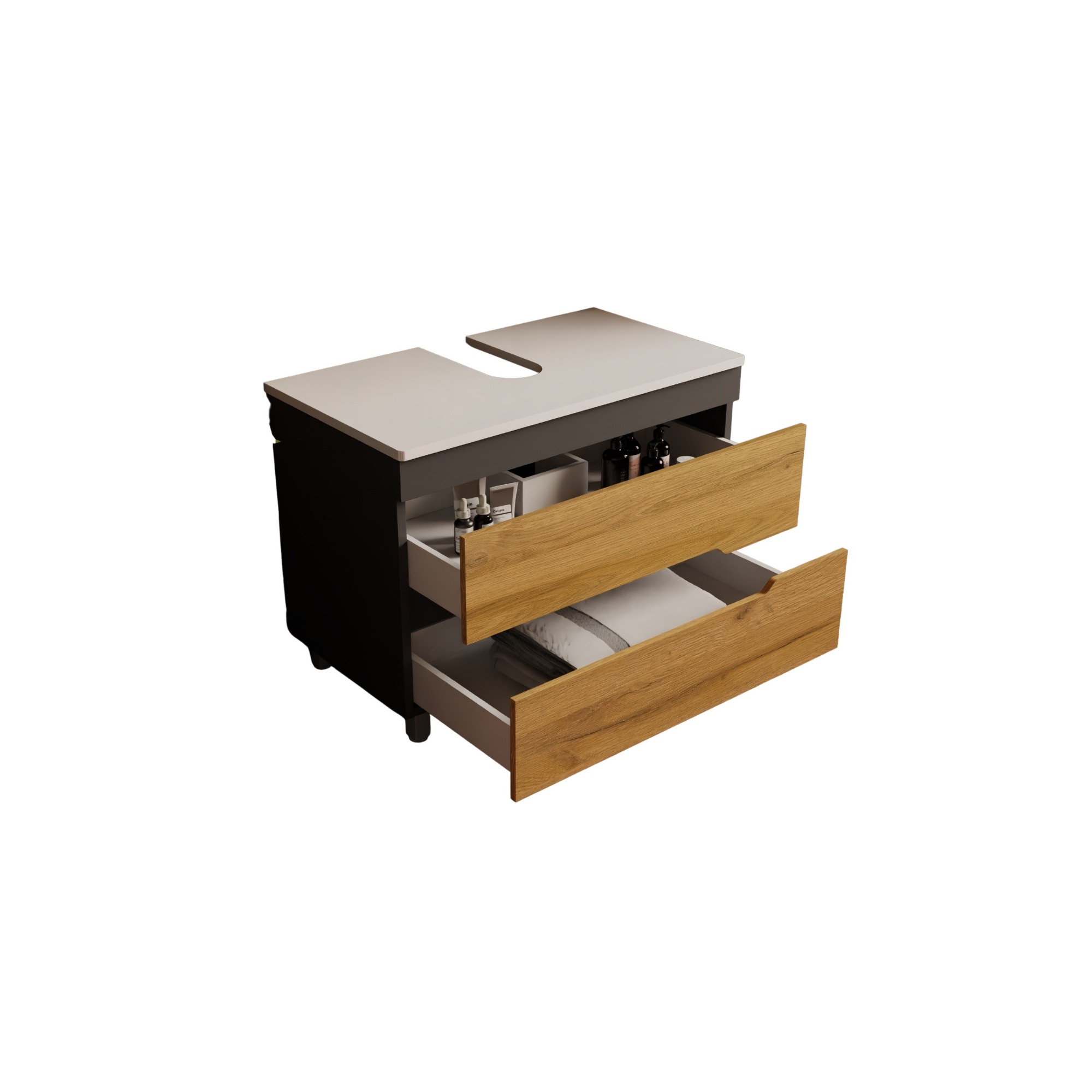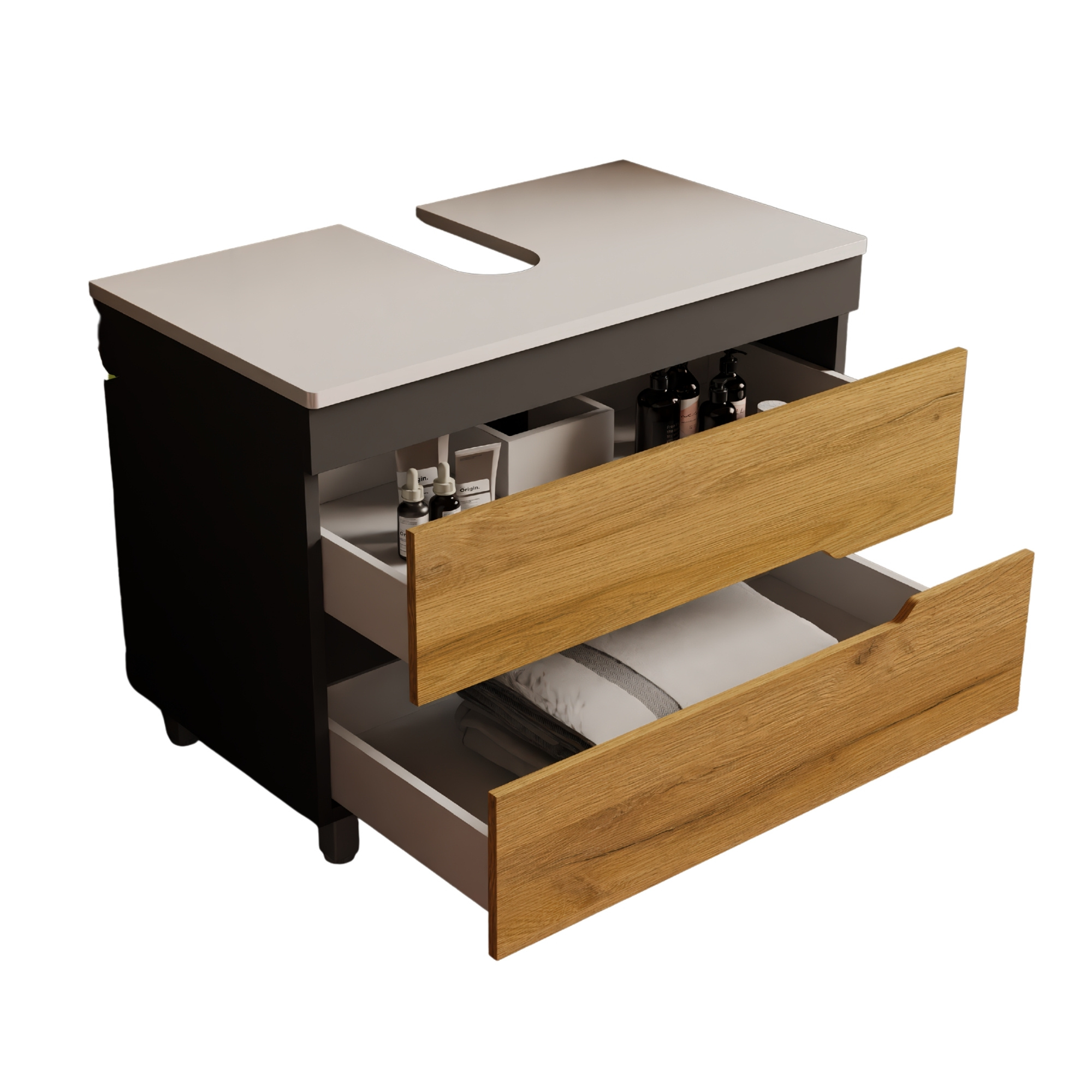 Die Marmara-Unterschränke bieten zwei großzügige Schubladen, die durch ihr innovatives Design und die nahtlosen Fronten einen modernen Akzent im Bad setzen. Die Schubladen des Waschbeckenunterschrank gleiten dank eines Dämpfungssystems leise und sanft zu. Für die Konstruktion des Waschtischunterschranks in Anthrazit und Eiche wird widerstandsfähiges MDF Lam verwendet, das mit einer strapazierfähigen Oberfläche versehen ist und so den täglichen Anforderungen im Badezimmer mühelos standhält.