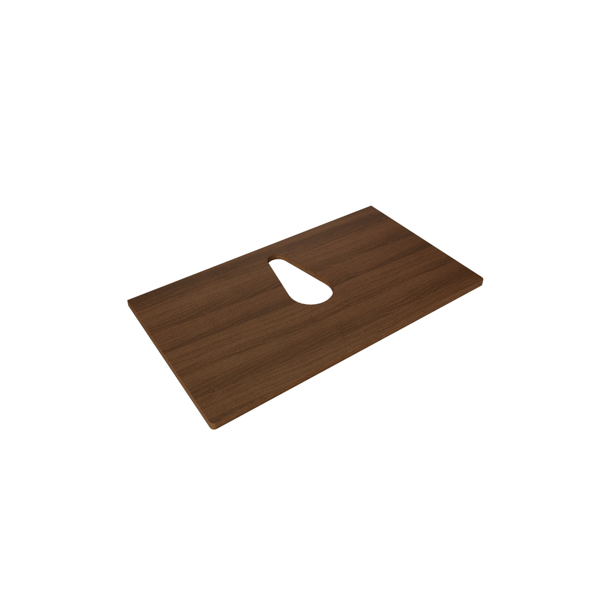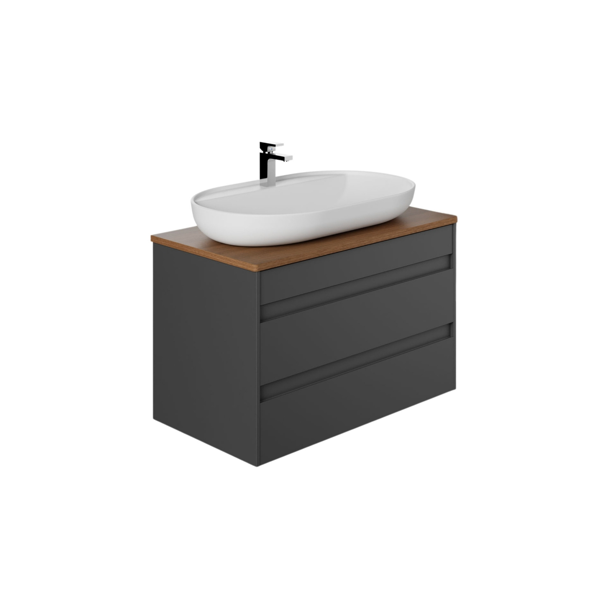 Die Waschtischplatte trägt das Becken passgenau und setzt eine warme und natürliche Note. Als Unterschrank mit Waschtischplatte ergänzt die Konsole mit Holzfurnier in Walnuss den anthrazitfarbenen Korpus stimmig. Die Oberfläche bietet Wiederstand gegen Feuchtigkeit und lässt sich leicht reinigen – wertig im Look, langlebig im Gebrauch.