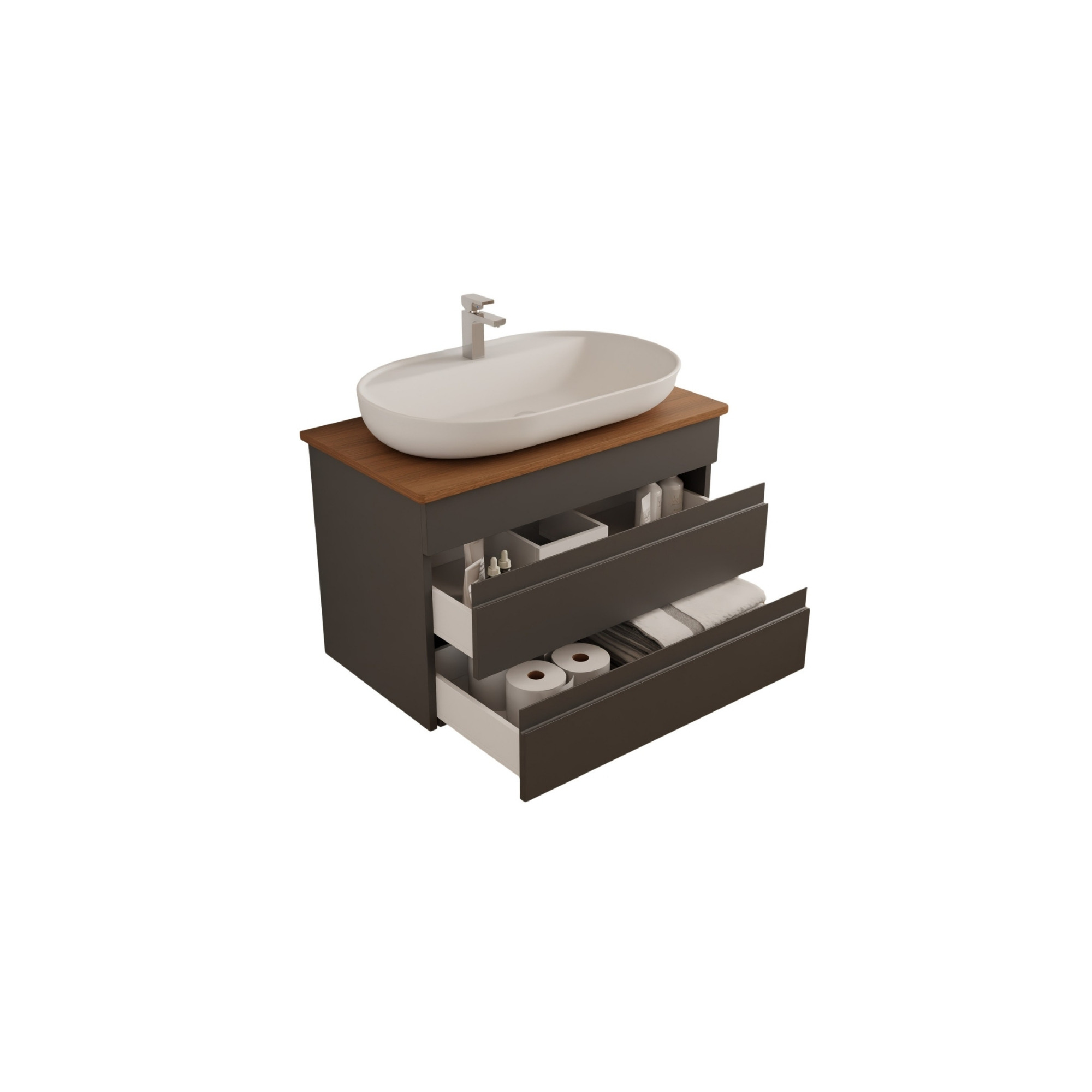 Waschtisch Walnuss mit Unterschrank hängend – 80 cm, Anthrazit, Keramik Aufsatz-Waschbecken, Waschtisch Set Lara