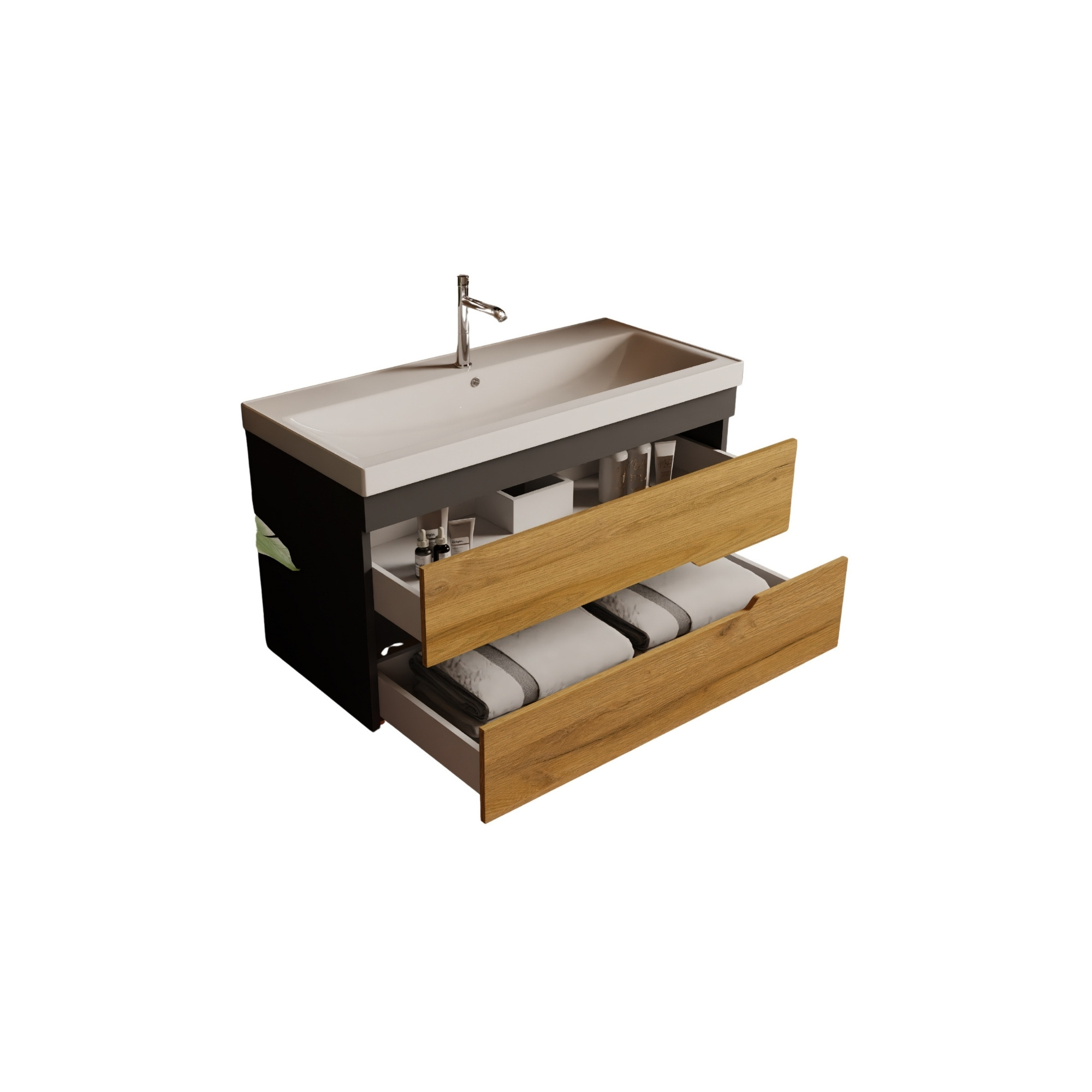 Ein Waschtisch auf einem hängenden Unterschrank hebt das Badezimmer auf ein funktional ansprechenderes Niveau. Der wandmontierte Badezimmerunterschrank sorgt für Platzeffizienz und vereinfacht die Bodenreinigung um ein Vielfaches. Die Schubladen mit der Softclose-Funktion sorgen für ein ergonomisches Handling bei Öffnen und Schließen des Waschtischunterschranks in 100 cm.