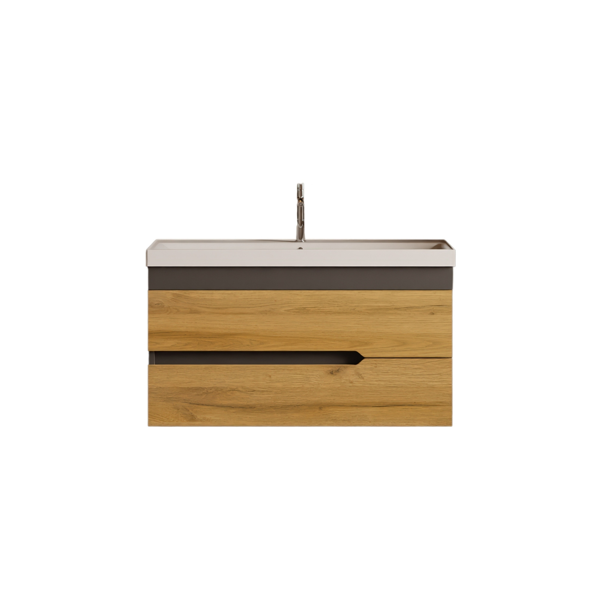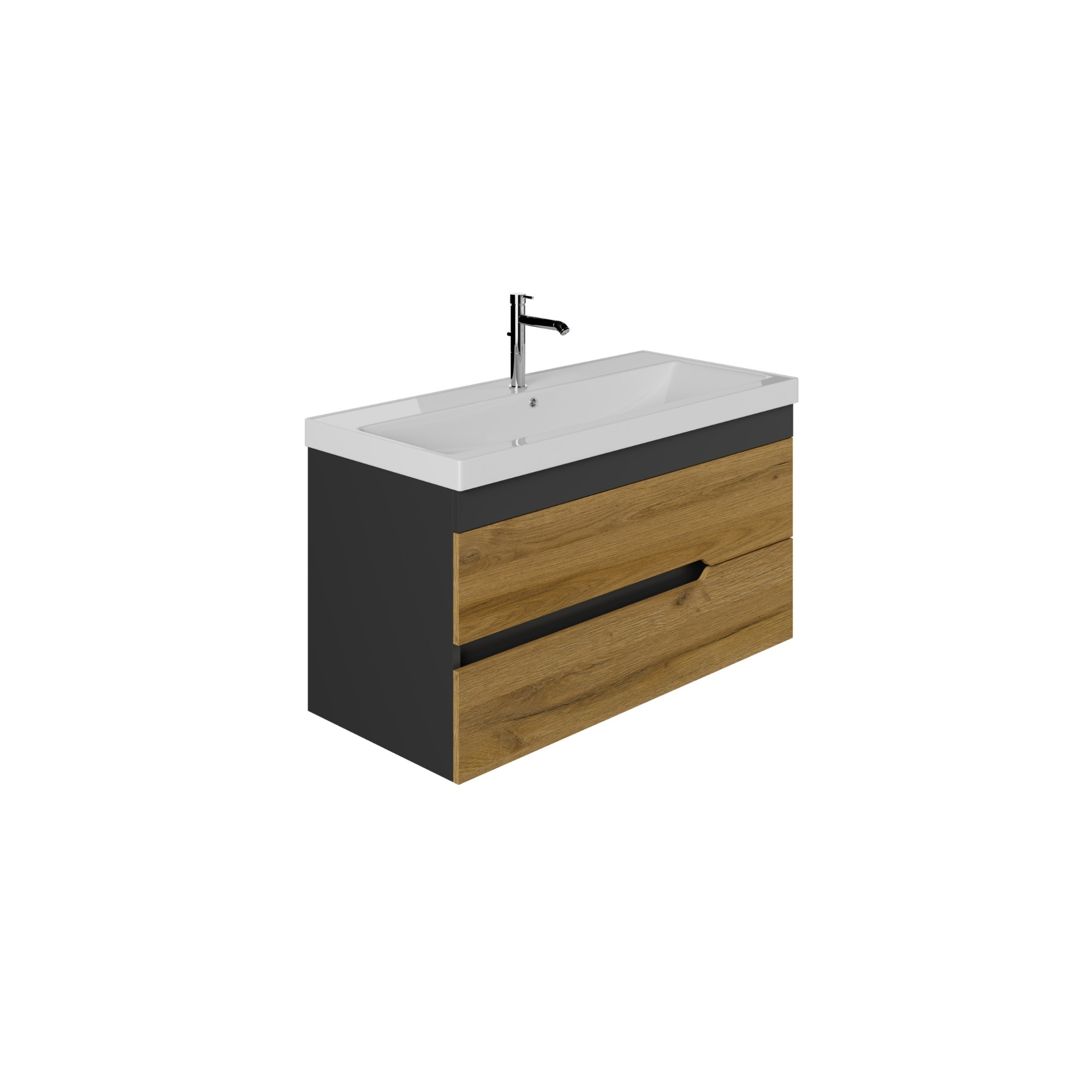 Die unverwechselbare Formgebung der Formen des Waschbeckenunterschranks gehen Hand in Hand mit den ästhetisch gestalteten Griffleisten. Insbesondere fallen die Farben in Eichenholz in Kombination mit dem Anthrazit gefärbten Korpus ins Auge bei diesem hängenden Badschrank. Dadurch strahlt der Waschplatz Innovationskraft und Design in der Optik aus.